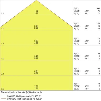 De gradenbundel geeft informatie over hoe breed het licht wordt uitgestraald. Dit zit tussen de 0 en 360 graden (D). Hoe kleiner de hoek, hoe specifieker de lichtbundel is. Over het algemeen is een smalle gradenbundel perfect voor sfeer- of accentverlichting, terwijl een brede gradenbundel ideaal is om grote oppervlaktes te verlichten.