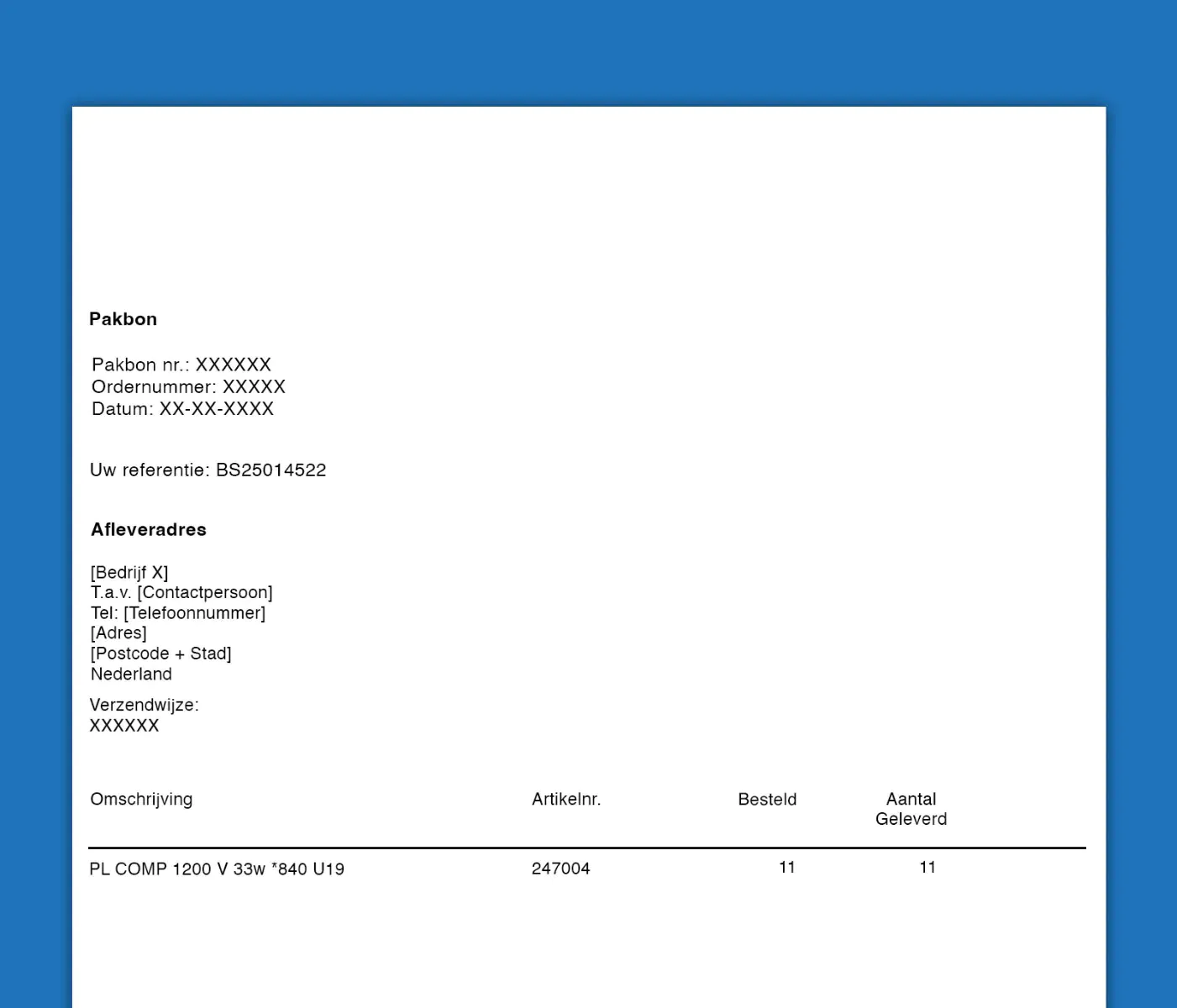 Een neutrale pakbon betekent dat een bestelling wordt geleverd met een pakbon en een transportlabel, waarop het Discountlight logo en de contactgegevens niet worden vermeld. Je kunt dit regelen met je persoonlijke accountmanager. Op de neutrale pakbon wordt enkel het afleveradres van de eindklant (jouw klant) vermeld.